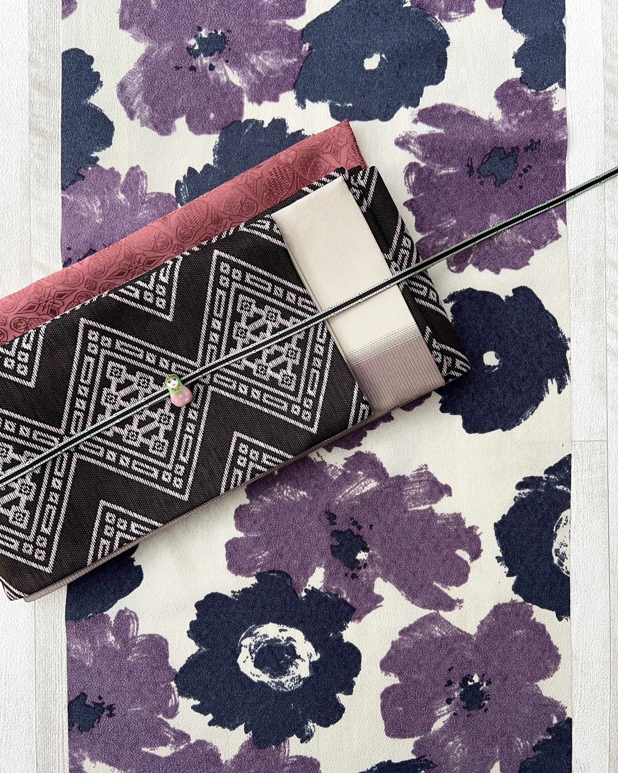 ポリエステルとは思えないとろみ感と落ち感があるため、小紋のような感覚で着ていただくことができます。また、鬼しぼのため地厚な生地になっているため、単衣で真夏以外に着ていただくことをお勧めしております。